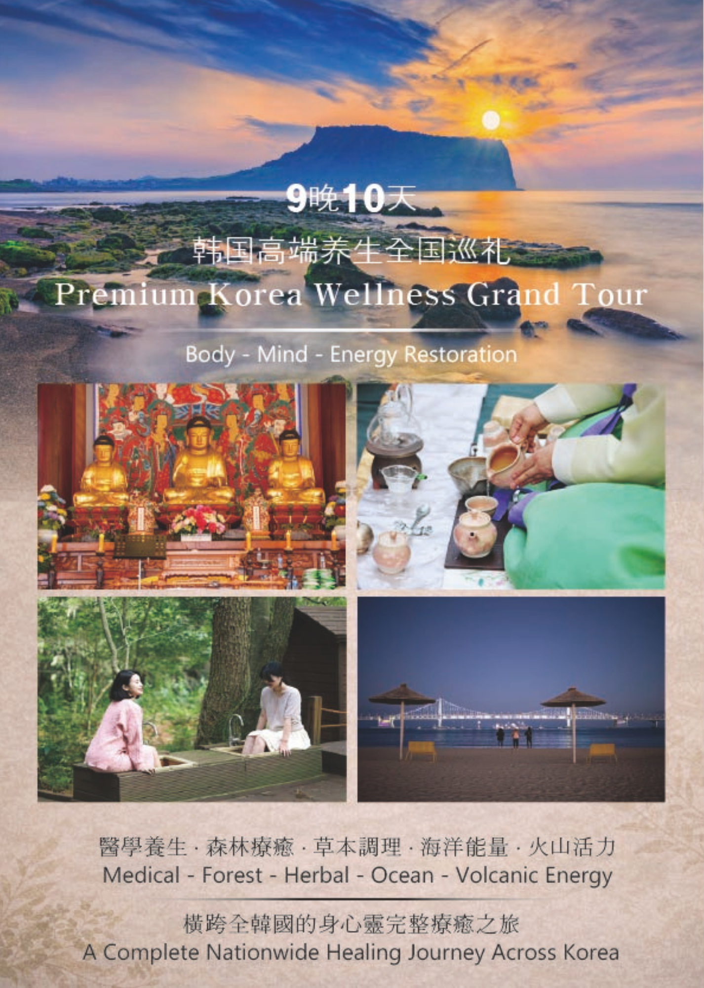 This nationwide journey across Korea integrates medical beauty, forest therapy, oriental medicine, tea wellness, ocean healing, and volcanic energy for a comprehensive body–mind restoration experience